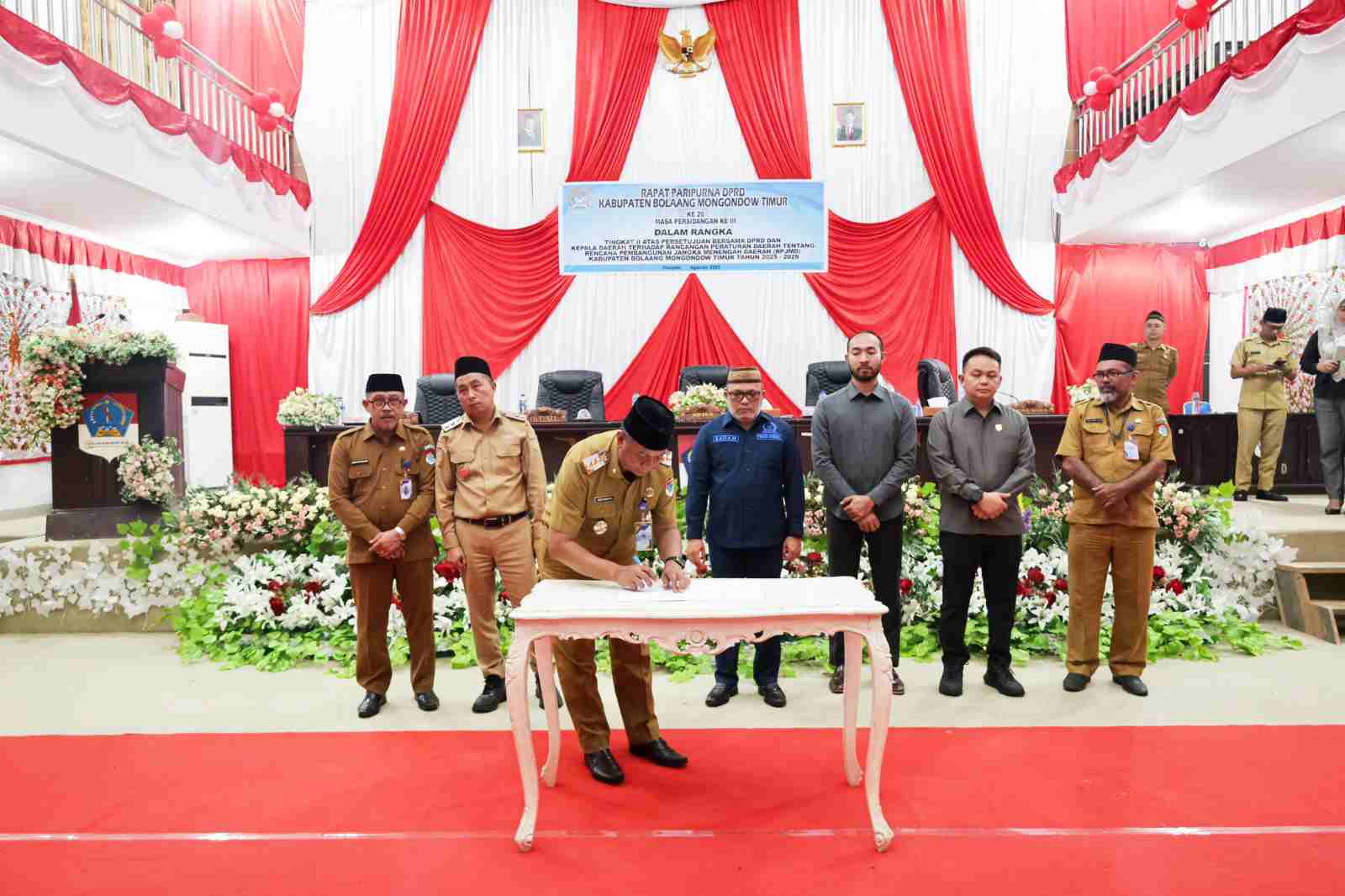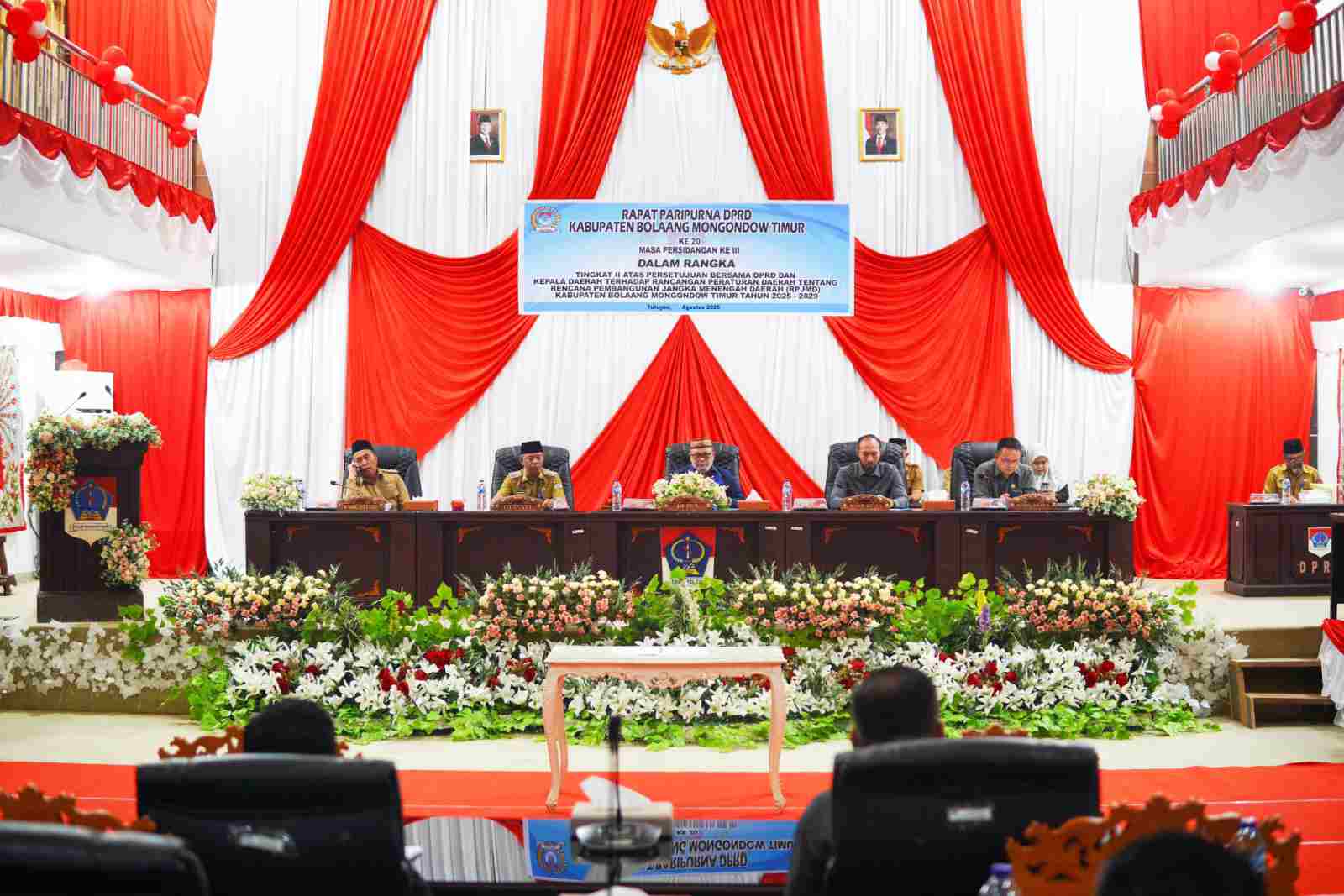 BOLTIM, SULAWESION.COM – Bupati Bolaang Mongondow Timur (Boltim) Oskar Manoppo dan Wakil Bupati Argo V. Sumaiku menghadiri Rapat Paripurna DPRD Kabupaten Boltim untuk penandatanganan kesepakatan bersama Rancangan Peraturan Daerah tentang Rencana Pembangunan Jangka Menengah Daerah (RPJMD) Tahun 2025–2029, Senin malam 11 Agustus 2025.