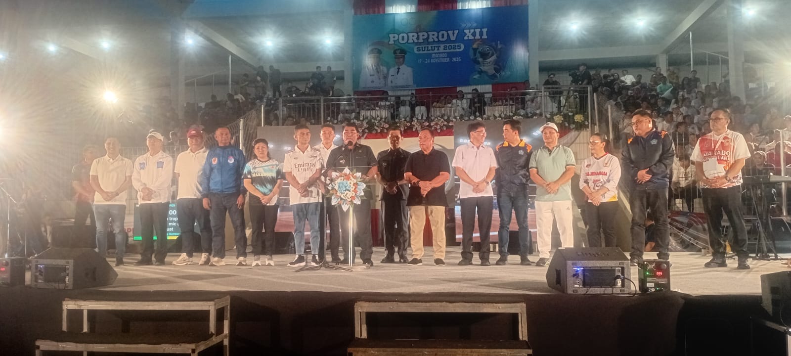 SULAWESION,MANADO — Gelora Stadion KONI Sario berubah menjadi lautan cahaya dan teriakan penuh euforia saat Porprov Sulawesi Utara XII resmi ditutup tadi malam. Ribuan pasang mata menoleh serempak ke arah panggung utama ketika Gubernur YSK melangkah naik ke podium, disambut gemuruh tepuk tangan yang seakan mengguncang tribun.