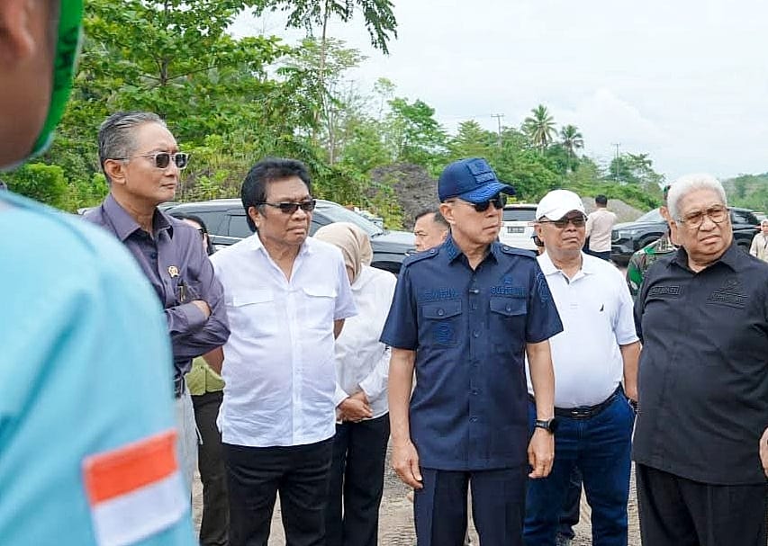 Menteri Pekerjaan Umum RI, Ir. Dody Hanggodo, MPE, (Pertama dari kiri) didampingi Wakil Komisi IV DPR RI, Ridwan Bae (kedua dari kiri), bersama Gubernur ASR (topi biru), dan Bupati Busel, H. Muh Adios (topi putih), serta Anggota DPR RI, H. Ali Mazi (pertama dari kanan), saat meninjau lokasi pembangunan jembatan Buton - Muna, Minggu (13/7/2025). (Foto: Ist)