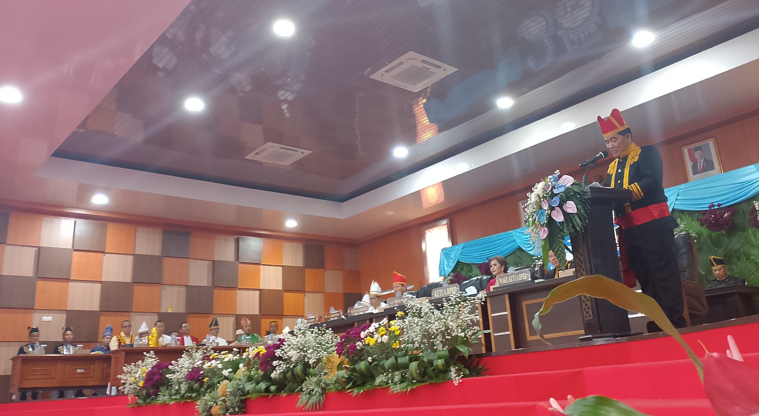 Gubernur Sulawesi Utara Yulius Selvanus saat memberikan sambutan HUT Kota Bitung ke 35 tahun di kantor DPRD Bitung. (Dokumentasi | Yaser Baginda)