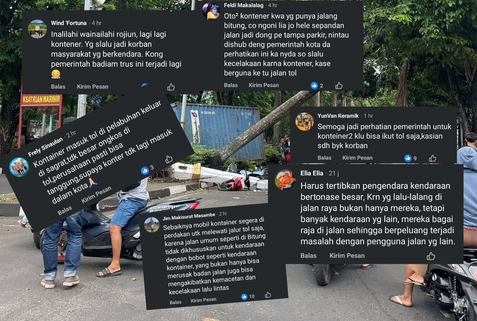 @Jim Makisurat Masambe _ Sebaiknya mobil kontainer segera di perdakan utk melewati jalur tol saja, karena jalan umum seperti di Bitung tidak dikhususkan untuk kendaraan dengan bobot seperti kendaraan kontainer, yang bukan hanya bisa merusak badan jalan juga bisa mengakibatkan kemacetan dan kecelakaan lalu lintas
