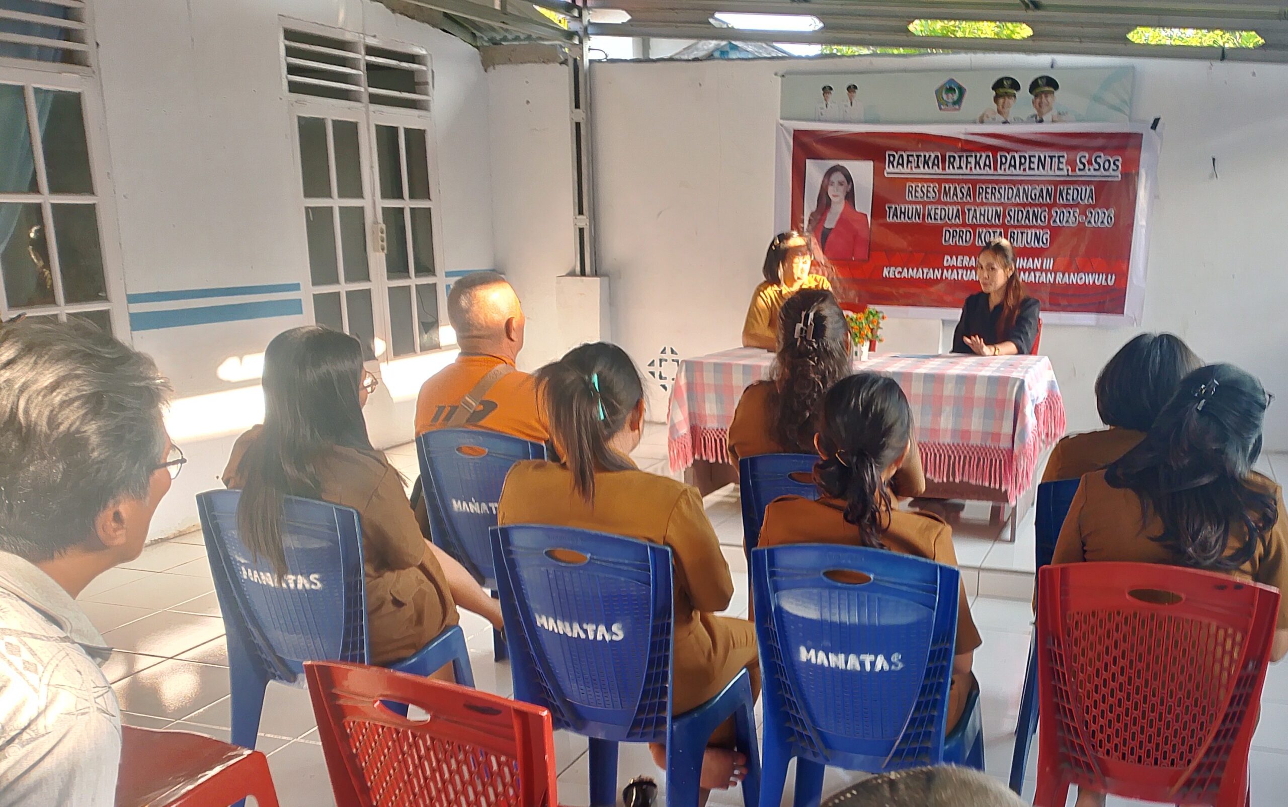 BITUNG, SULAWESION.COM – Anggota DPRD Kota Bitung Rafika Papente menggelar reses di Kelurahan Manembo-nembo Atas, Kecamatan Matuari, Kota Bitung, Selasa (31/03/2026) sore.