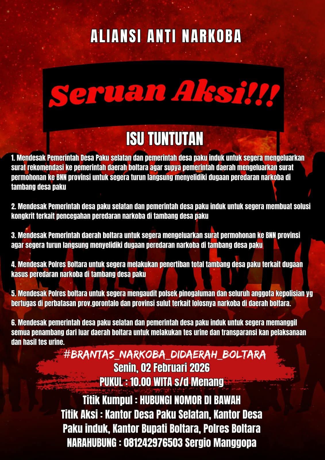 BOLMUT,SULAWESION.COM- Beredar seruan aksi demo terkait masalah narkoba yang bakal digelar hari ini menjadi perhatian publik di Kabupaten Bolaang Mongondow Utara (Bolmut) Senin 2 Februari 2026.