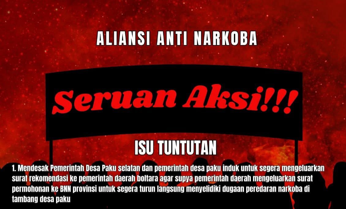Dalam poster yang beredar dimedia sosial aksi itu akan digelar oleh Aliansi Anti Narkoba dimana terlihat ada enam tuntutan.