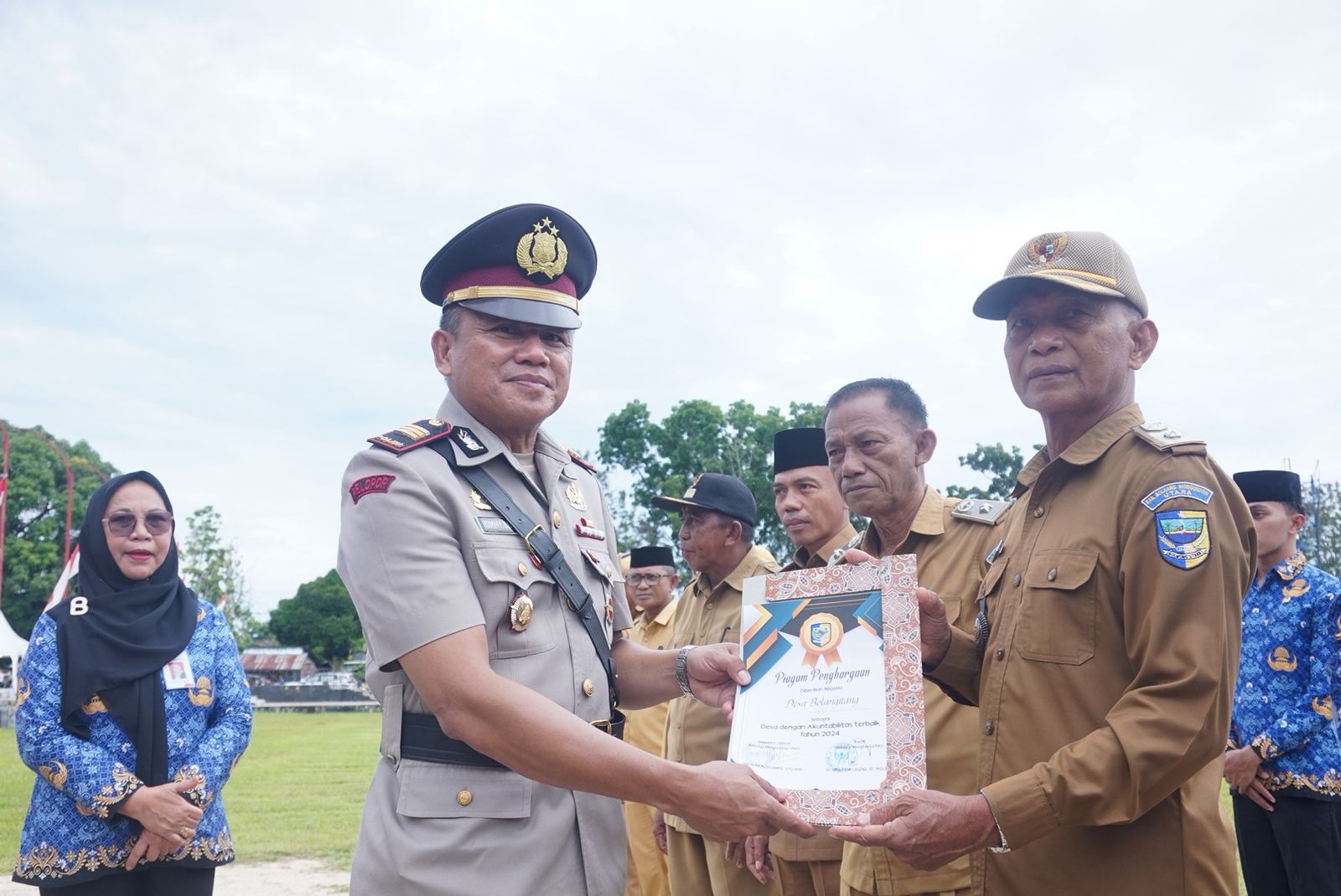 Upacara yang dirangkaikan dengan peringatan Hari Anti Korupsi Sedunia (HAKORDIA) tersebut dimana Bupati Boltmut Sirajudin Lasena didampingi wakil Bupati Aditya Pontoh dan forkompimda menyerahkan piagam penghargaan desa dengan akuntabilitas terbaik tahun 2024.