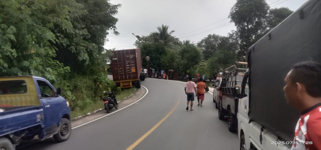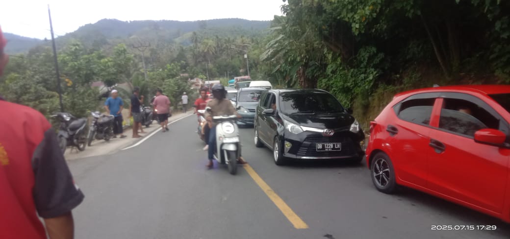 BOLMUT,SULAWESION.COM- Macet terjadi di jalan trans Sulawesi di desa Nunuka, Kecamatan Bolangitang Timur, Kabupaten Bolaang Mongondow Utara (Bolmut), Selasa 15 Juli 2025.