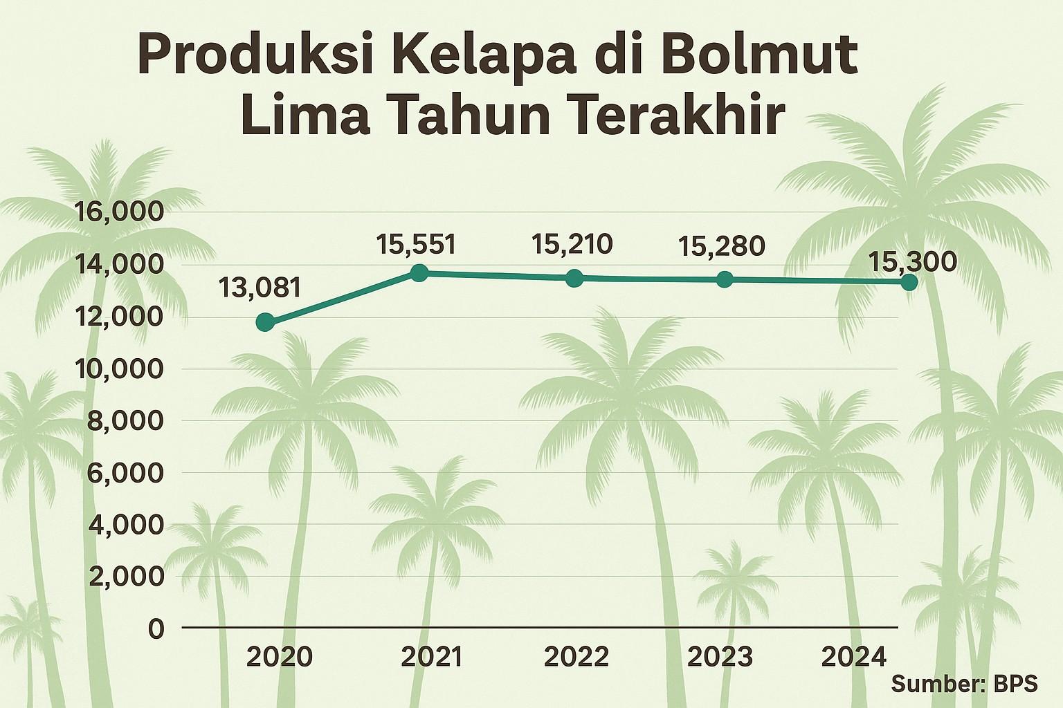 Sementara itu data Badan Pusat Statistik (BPS) Kabupaten Bolmut produksi kelapa pada tahun 2024 mencapai 15.300 ton. Pada tahun 2023 mencapai 15.280 ton.