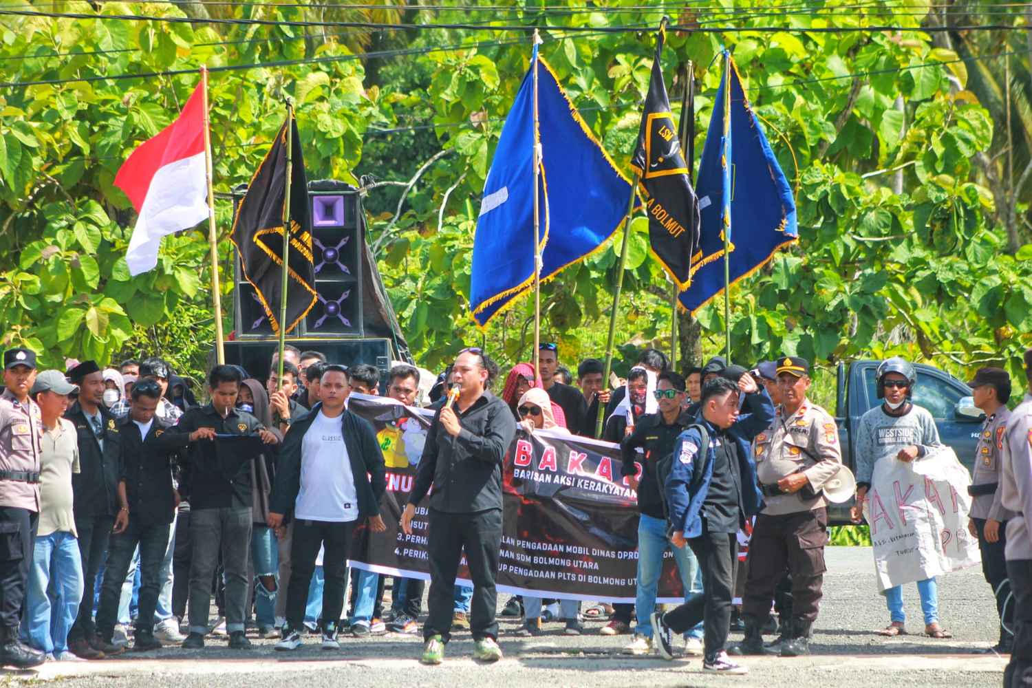BOLMUT,SULAWESION.COM- Massa aksi yang tergabung dalam Aliansi Barisan Aksi Kerakyatan (BAKAR) menggelar demo di kantor Bupati Bolaang Mongondow Utara (Bolmut) Senin 8 September 2025.