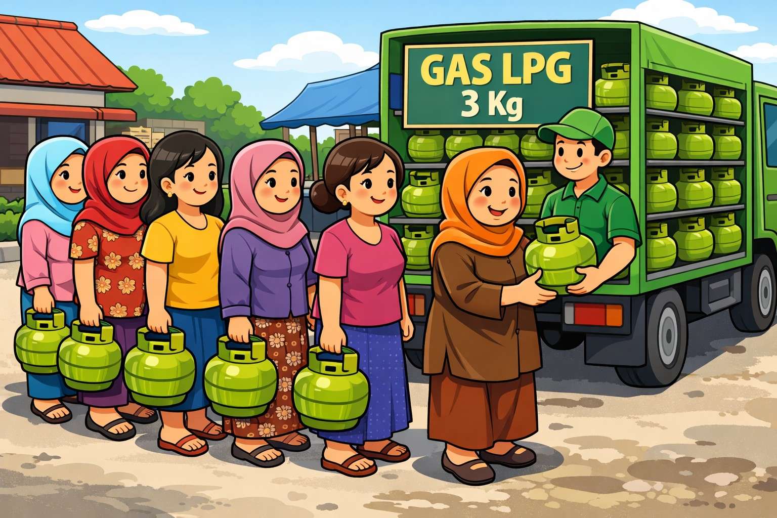 Ilustrasi ibu-ibu mengantri gas LPG 3 Kg. (Foto AI Chatgpt)