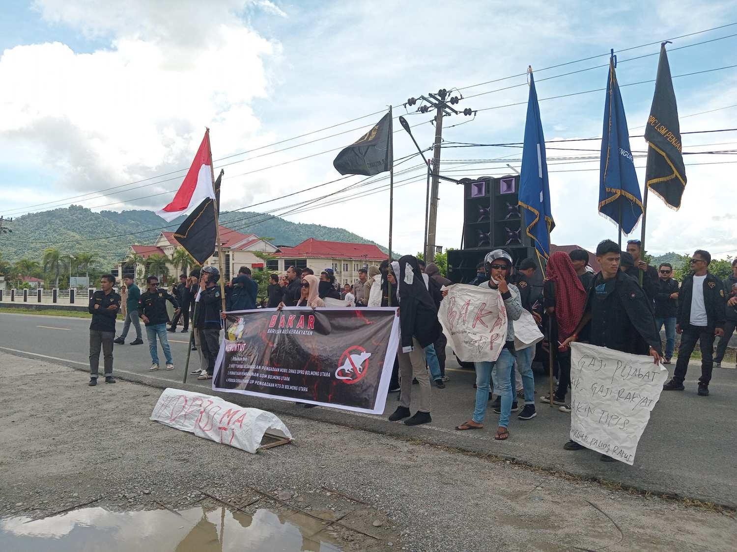 Aksi demo yang digelar oleh Aliansi Barisan Aksi Kerakyatan (BAKAR) menyampaikan beberapa tuntutan diantaranya buparkan DPR. Usut tuntas kejanggalan pengadaan mobil dinas DPRD Bolmut.
