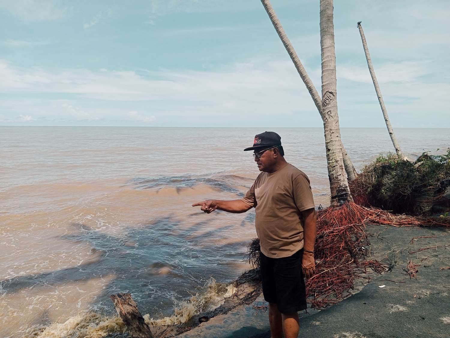 Didampingi suaminya, Felmawati mengatakan abrasi ini semakin parah dalam dua tahun terakhir. Pohon kelapa roboh. Bahkan kebun yang ia tanam beberapa tanaman sudah hilang akibat abrasi.