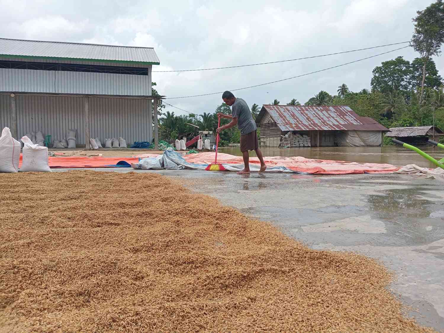 Pantuan media ini, Harun menjemur kembali padi yang terendam air. Menurutnya sebagian padi yang basah sudah diisi dalam karung dan dipindahkan.