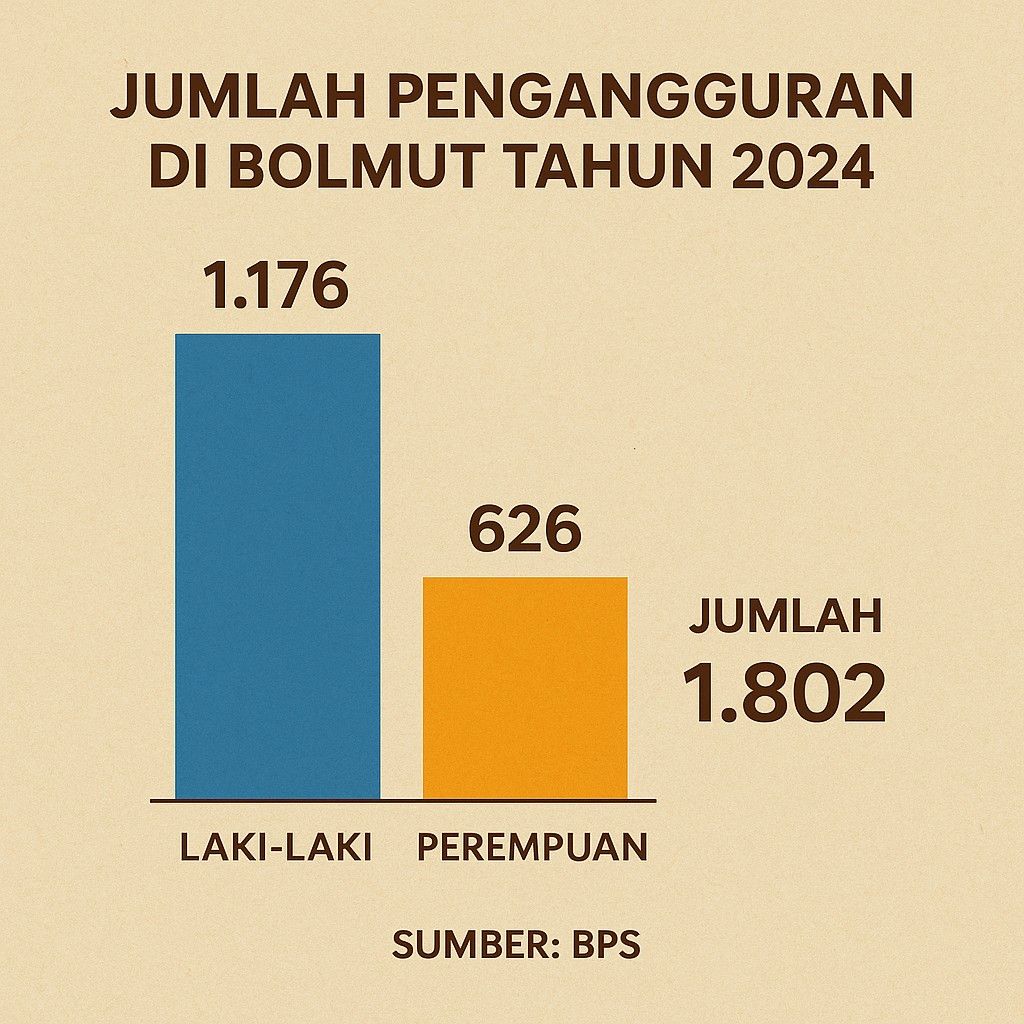 Data Badan Pusat Statistik (BPS) Kabupaten Bolmut pada tahun 2024, jumlah pengangguran di Bolmut mencapai 1802. Angka ini turun dibandingkan pada tahun 2023 dimana pengangguran mencapai 1853.