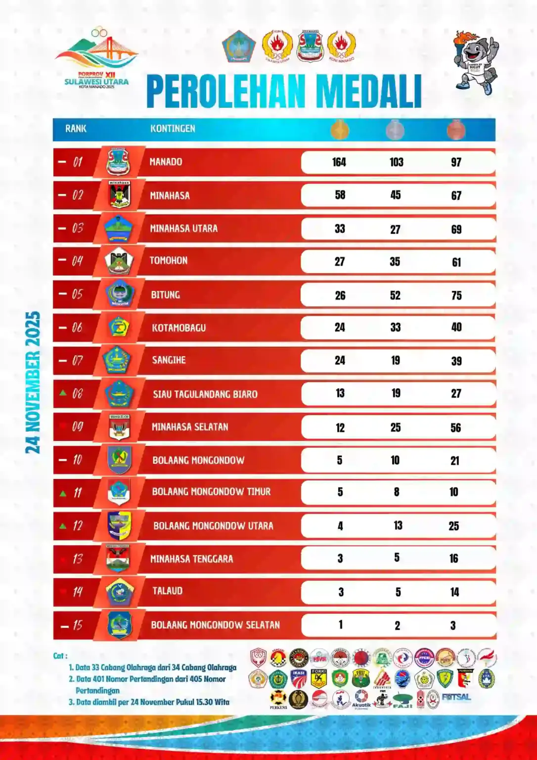 Di puncak klasemen, Kota Manado tampil sebagai juara umum dengan perolehan 164 emas, 103 perak, dan 97 perunggu.