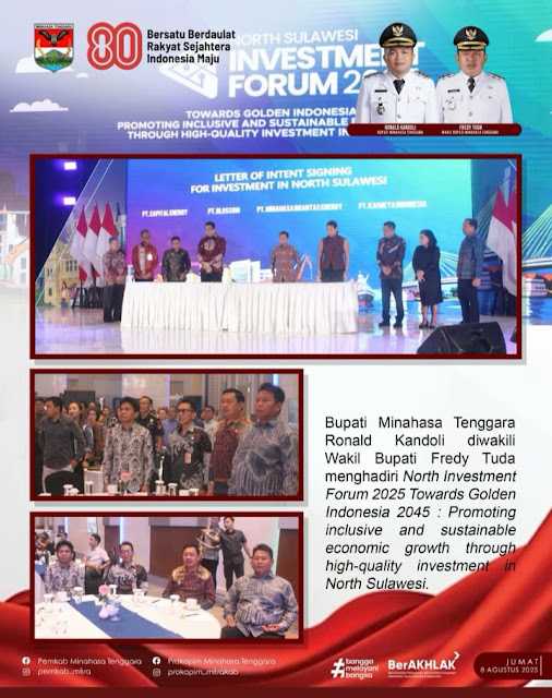 MANADO, SULAWESION.COM — Wakil Bupati Minahasa Tenggara (Mitra) Fredy Tuda menghadiri North Investment Forum 2025 di Hotel Four Points Manado, Jumat (8/8/2025). Forum bertema “Towards Golden Indonesia 2045: Promoting Inclusive and Sustainable Economic Growth through High Investment in North Sulawesi” ini menjadi ajang mempromosikan potensi investasi di Sulawesi Utara.