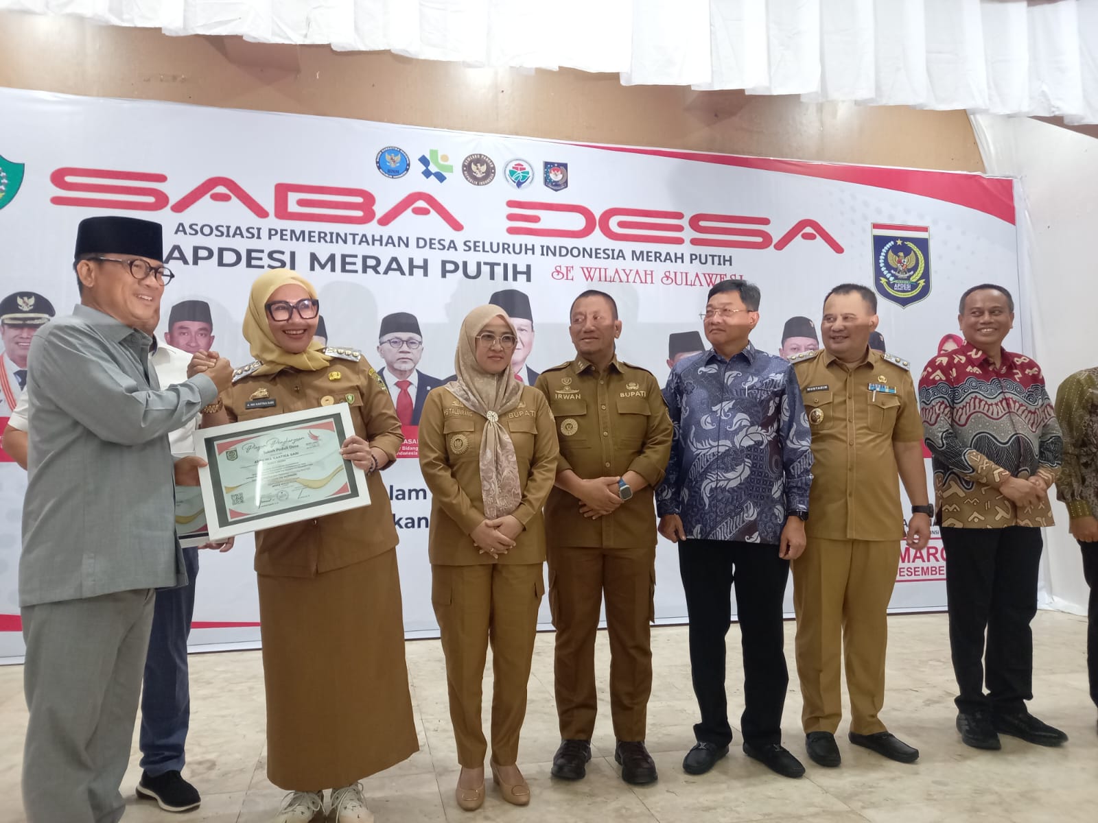 Penghargaan diserahkan Menteri Desa dan Pembangunan Daerah Tertinggal, Yandri Susanto, di acara Saba Desa APDESI Merah Putih se-Sulawesi di Gedung Serbaguna Maros, Selasa (2/12/2025).