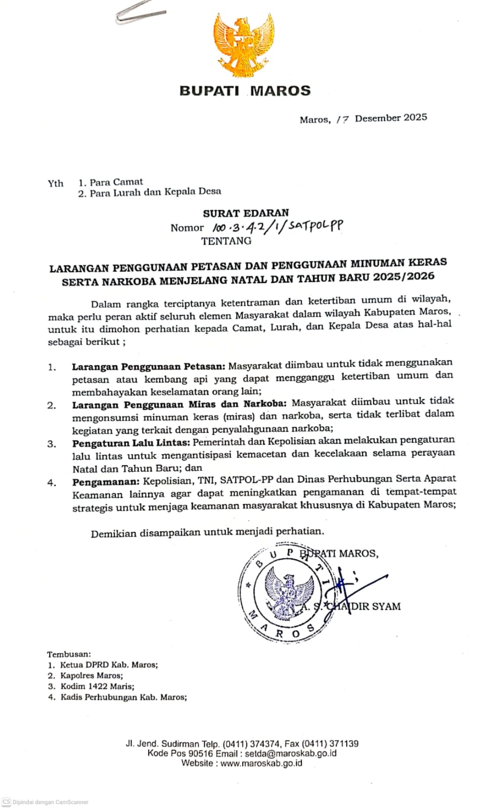 Bupati Maros, H.A.S. Chaidir Syam, resmi menerbitkan Surat Edaran Nomor: 100.3.4.2/1/SATPOLPP yang mengatur sejumlah larangan dan langkah pengamanan selama momen Nataru.