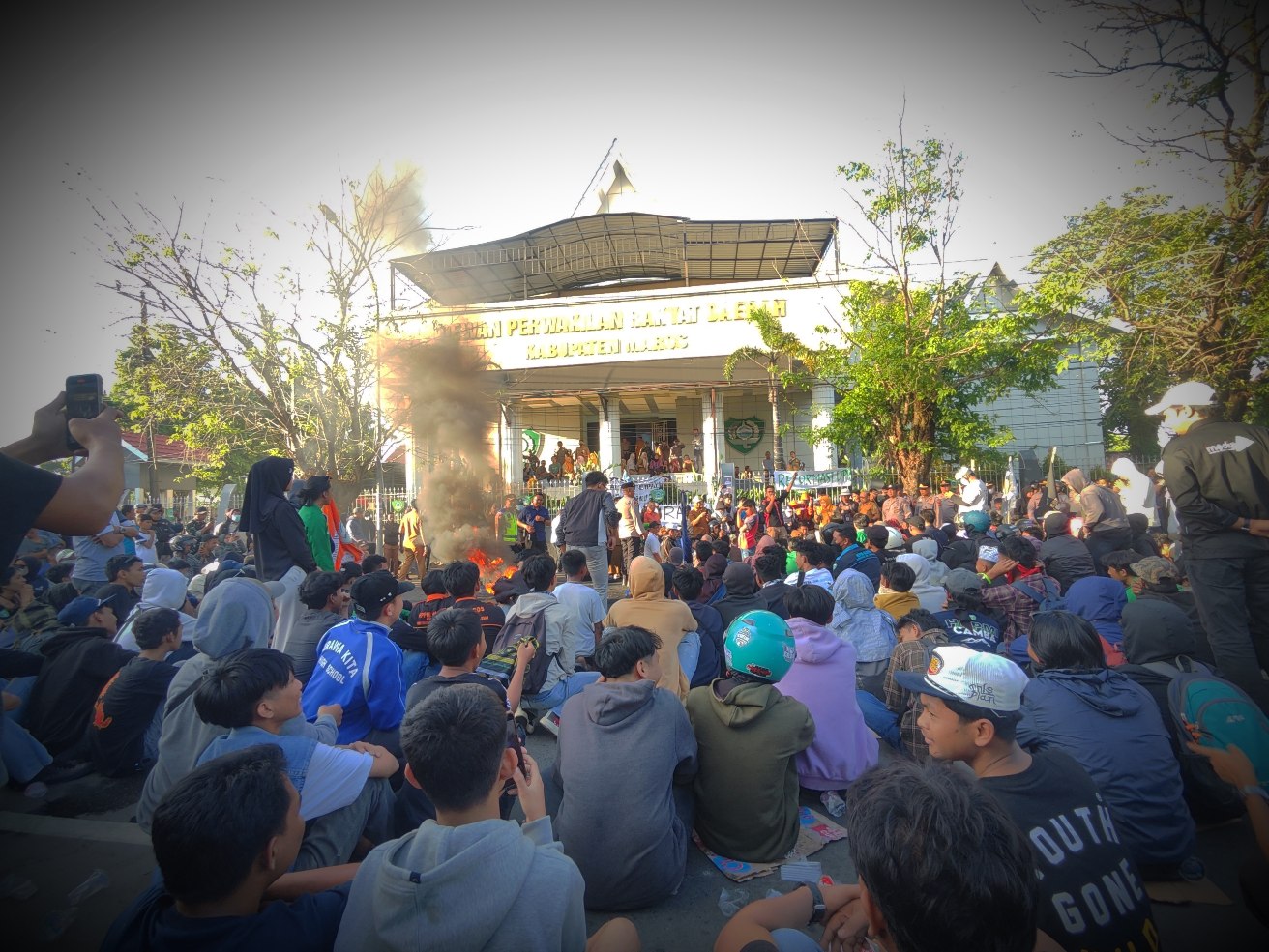 MAROS, SULAWESION.COM – Ratusan massa yang tergabung dalam Aliansi Maros Menggugat menggelar aksi demonstrasi di depan Kantor Bupati dan Gedung DPRD Maros, Senin (1/9/2025). Lebih dari 300 orang berjalan kaki dari Kantor Bupati menuju gedung DPRD sambil membawa berbagai tuntutan.