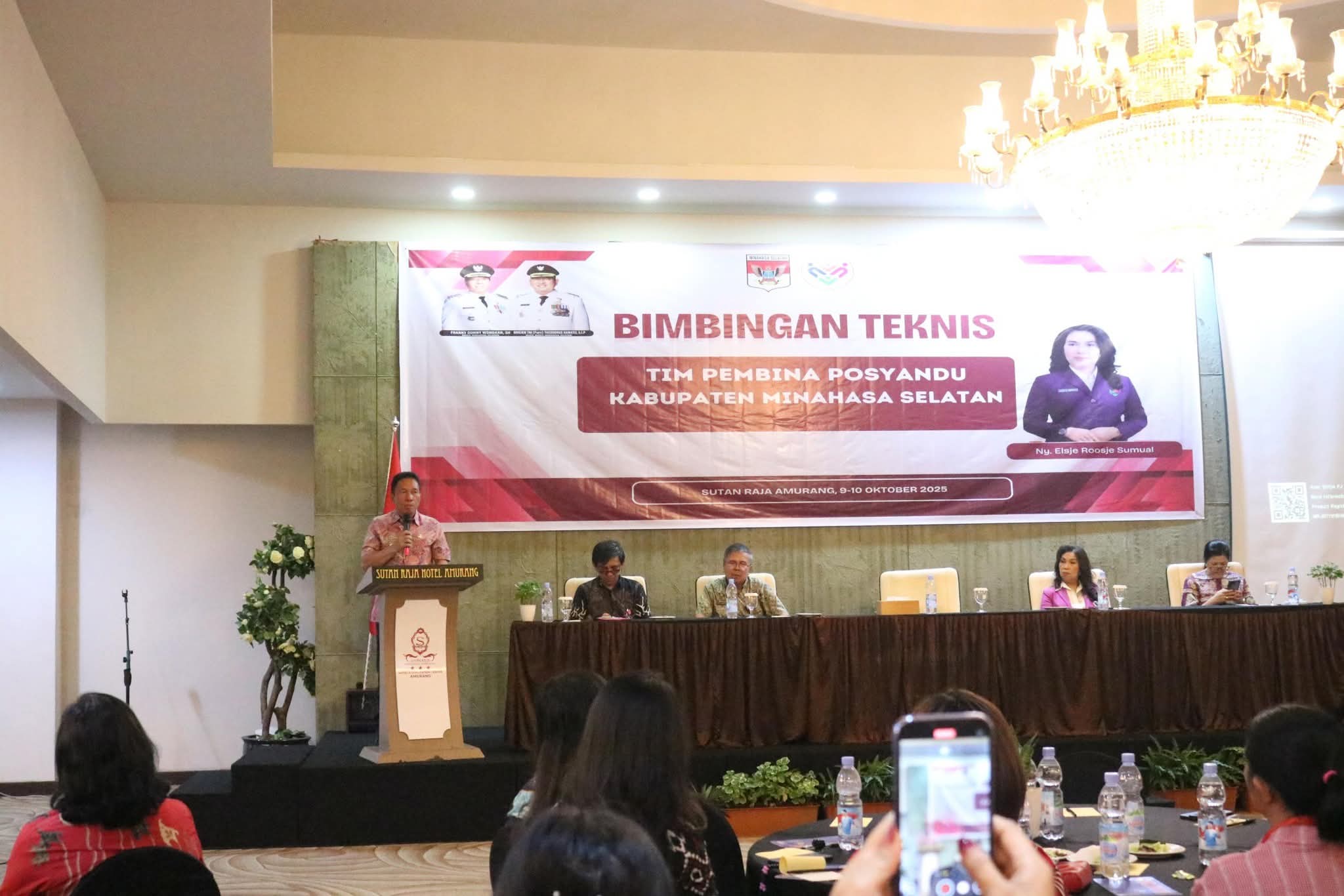 MINSEL,SULAWESION.COM- Bupati Minahasa Selatan (Minsel) Franky Donny Wongkar, S.H. secara resmi membuka Kegiatan Bimbingan Teknis (Bimtek) Tim Pembina Posyandu Kabupaten Minahasa Selatan, yang dirangkaikan dengan pelantikan Tim Pembina Posyandu periode 2025–2030, Kamis (9/10/2025) di Sutan Raja Hotel Amurang.