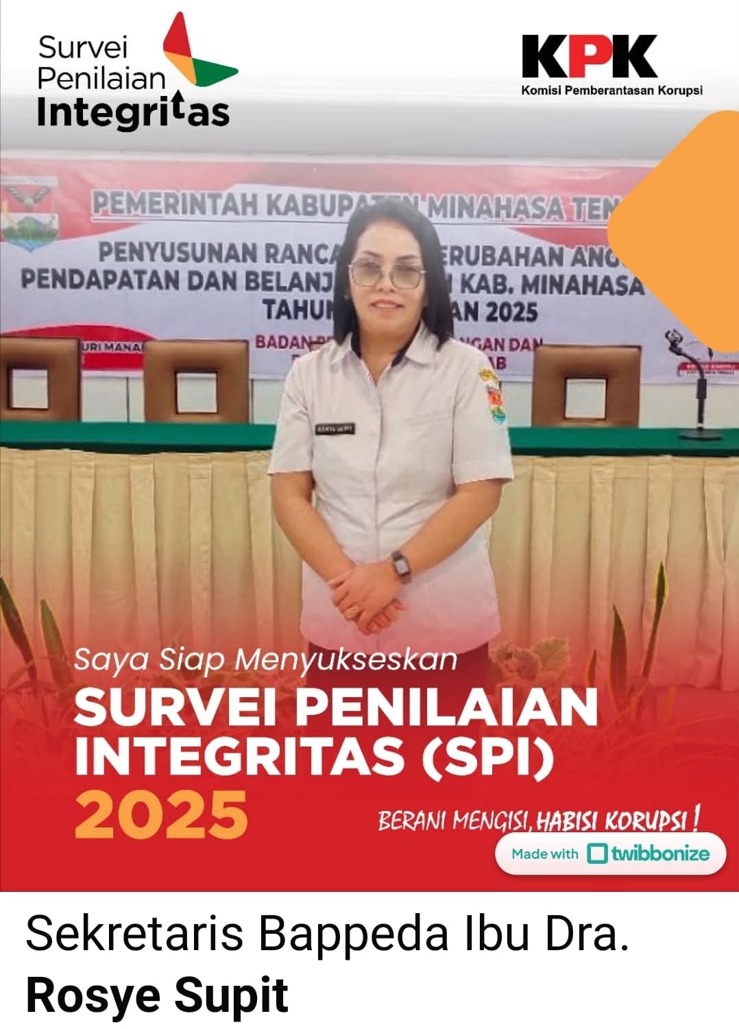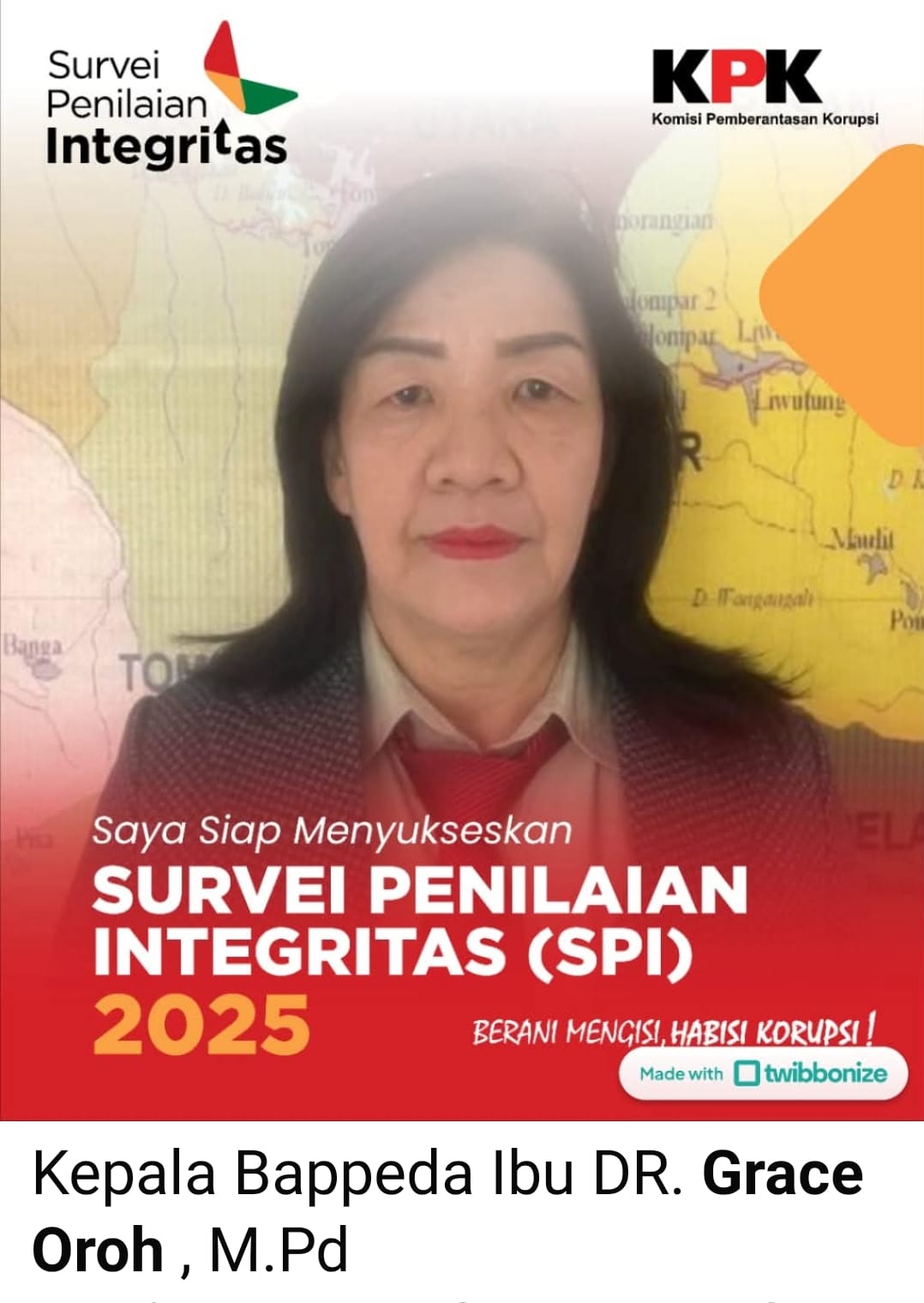 MITRA,SULAWESION.COM – Kepala Badan Perencanaan Pembangunan Daerah (Bappeda) Kabupaten Minahasa Tenggara (Mitra) Dr. Grace Oroh, M.Pd dan seluruh jajaran dan ASN serta Pegawai P3K, menyatakan dukungan penuh terhadap pelaksanaan Survei Penilaian Integritas (SPI) 2025 yang diselenggarakan oleh Komisi Pemberantasan Korupsi (KPK).