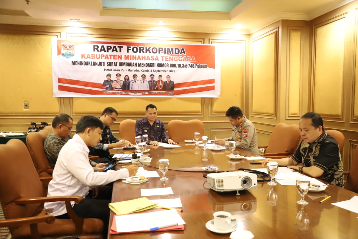 MANADO,SULAWESION,COM-Bupati Minahasa Tenggara Ronald Kandoli memimpin rapat Forum Koordinasi Pimpinan Daerah (Forkopimda) di Hotel Grand Puri Manado, Kamis (4/9/2025). Pertemuan itu membahas langkah antisipasi dampak aksi unjuk rasa serta upaya pencegahan provokasi, hoaks, dan ujaran kebencian.