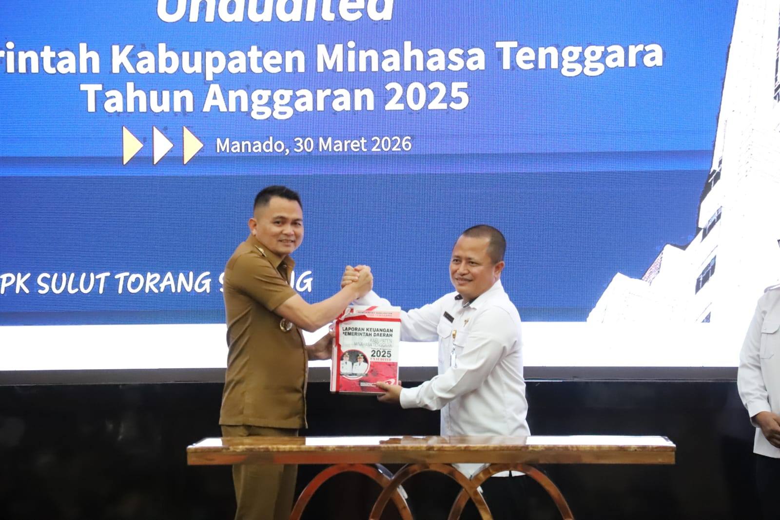 MANADO,SULAWESION.COM-Bupati Minahasa Tenggara (Mitra), Ronald Kandoli, menyerahkan Laporan Keuangan Pemerintah Daerah (LKPD) Unaudited Tahun Anggaran 2025 kepada Badan Pemeriksa Keuangan (BPK) RI Perwakilan Sulawesi Utara, bertepatan dengan hari ulang tahunnya yang ke-48, Senin (30/3/2026).