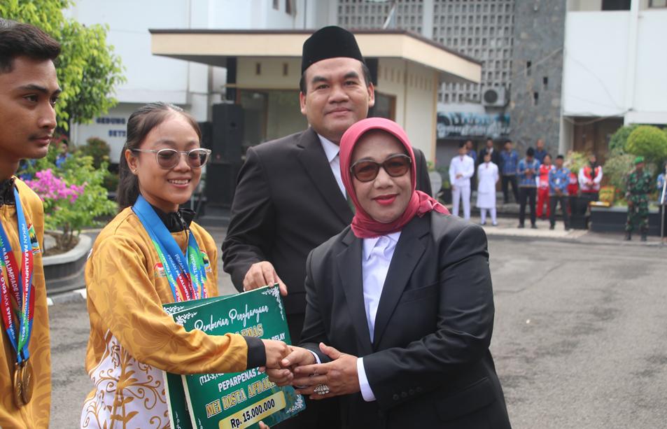 “Hari ini kita tidak lagi mengangkat bambu runcing, tetapi mengangkat ilmu, kerja keras, dan kejujuran. Namun semangatnya tetap sama: Indonesia harus berdiri tegak, Indonesia tidak boleh kalah,” ucap Bupati Arief Rohman membacakan amanat Menpora.