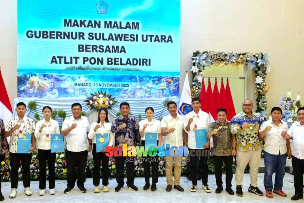 SULAWESION,MANADO — Gubernur Sulawesi Utara Yulius Selvanus Komaling memberikan bonus kepada para atlet beladiri asal Sulut yang meraih medali pada ajang PON Beladiri di Kudus. Penyerahan bonus berlangsung di Wisma Negara Bumi Beringin, Manado, Kamis (13/11/2025), dalam acara makan malam bersama atlet dan pelatih.
