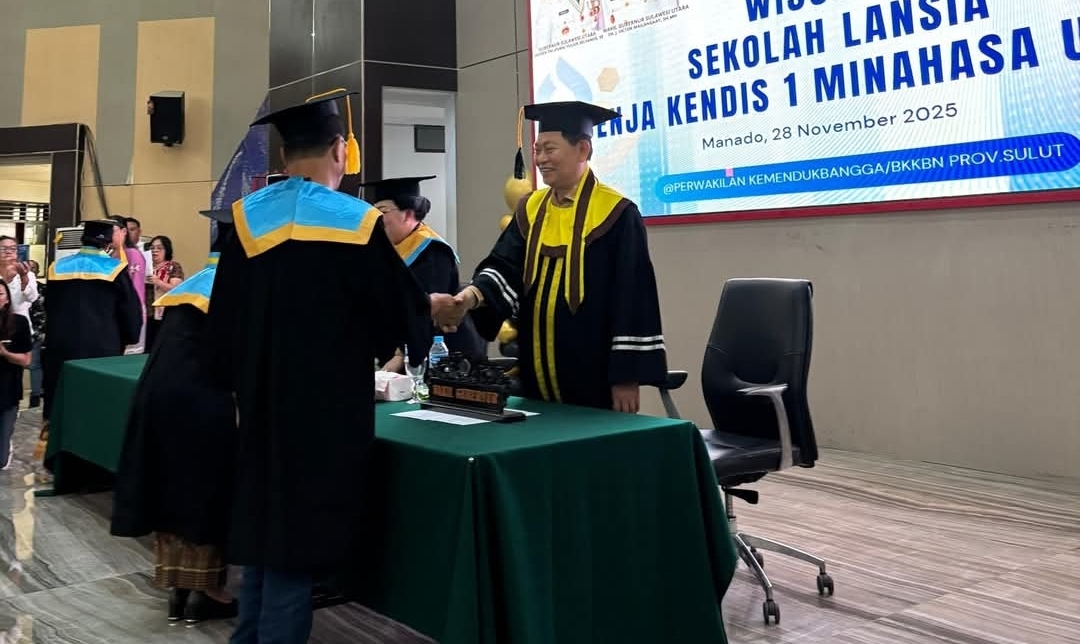 SULAWESION,MANADO — Suasana Aula Mapalus, Kantor Gubernur Sulawesi Utara, tampak berbeda pada Jumat pagi (28/11/2025). Deretan kursi terisi rapi oleh para peserta Sekolah Lansia dengan wajah sumringah, sebagian mengenakan selempang berwarna cerah, sebagian lagi ditemani keluarga yang sejak awal memegang ponsel untuk mengabadikan momen bersejarah tersebut.