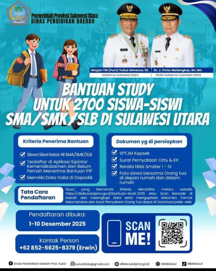 Siswa yang telah memenuhi seluruh persyaratan dapat mendaftar melalui laman resmi dikdasulutprov.go.id/bantuan-studi-2025. Pendaftaran dibuka mulai 1 hingga 10 Desember 2025.