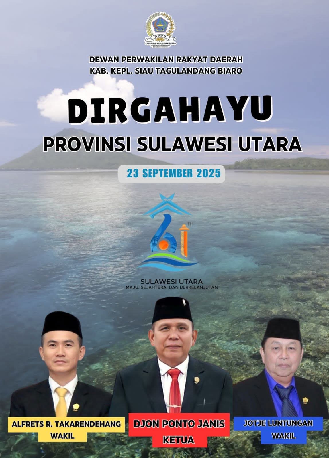 SITARO,SULAWESION.COM- Dewan Perwakilan Rakyat Daerah (DPRD) Kabupaten Kepulauan Siau Tagulandang Biaro (Sitaro) menyampaikan ucapan selamat memperingati Hari Ulang Tahun (HUT) ke-61 Provinsi Sulawesi Utara yang jatuh pada tanggal 23 September 2025.