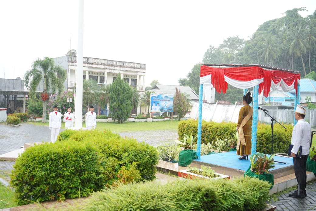 Meski diguyur hujan yang cukup lebat, namum upacara yang dipimpin langsung Bupati Chyntia Kalangit itu tetap berjalan kidmat dan penuh semangat, berbalut nuansa budaya karena para peserta yang mengenakan pakaian adat.