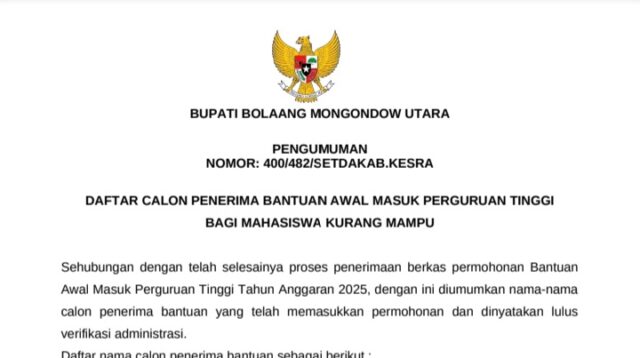 BOLMUT,SULAWESION.COM- Pemerintah Kabupaten (Pemkab) Bolaang Mongondow Utara (Bolmut) mengumumkan daftar calon penerima bantuan (beasiswa) awal […]
