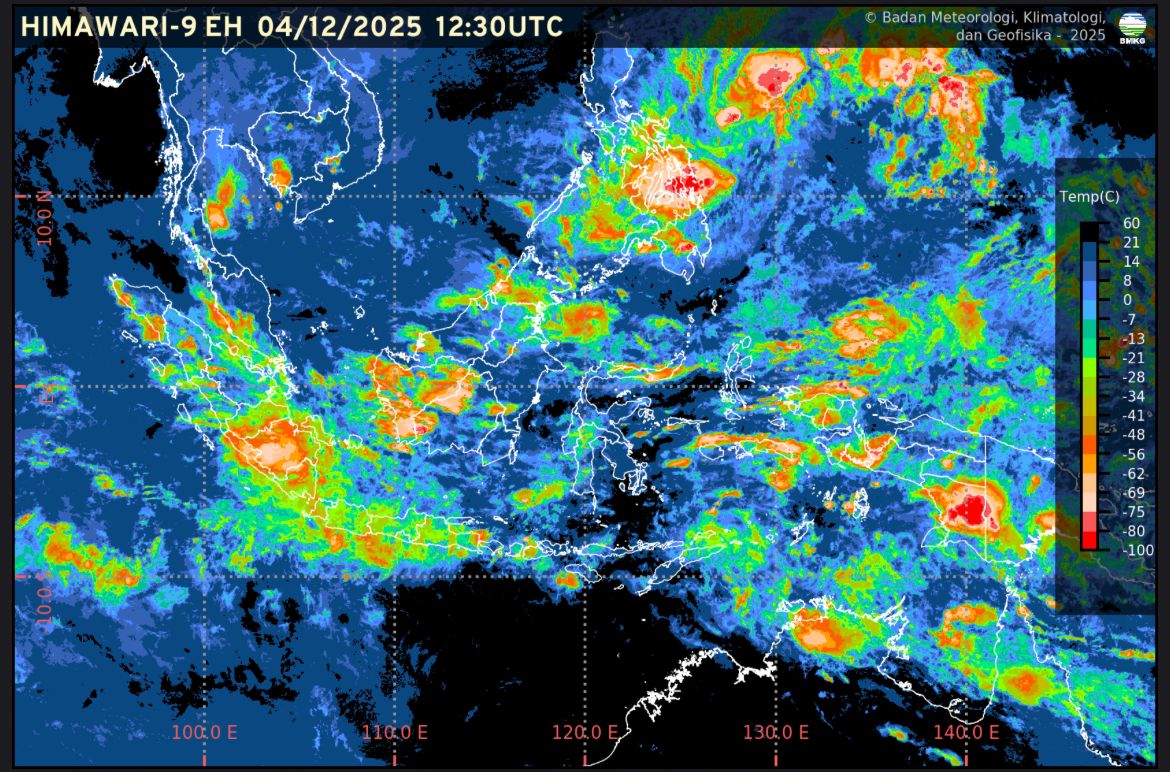 Sementara pada 8–11 Desember 2025, hujan lebat berpotensi terjadi di Sumatera Utara, Riau, Jambi, Kepulauan Bangka Belitung, Bengkulu, Lampung, Jawa Barat, Jawa Timur, Nusa Tenggara Barat, Kalimantan Barat, dan Papua Pegunungan. Peluang angin kencang juga muncul di beberapa wilayah Maluku Utara dan Sulawesi Utara.