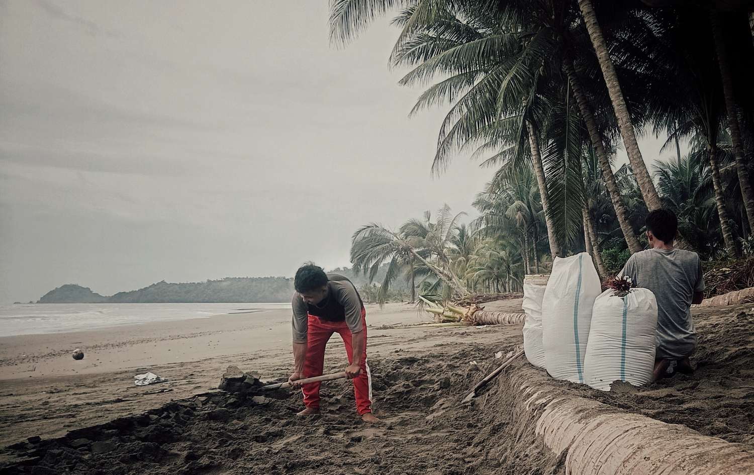 Mereka terlihat mengisi karung dengan pasir. Ada yang mengisi dengan alat sekop. Ada yang menyusun karung berisi pasir. Mereka terlihat bersama-sama mencegah abrasi.