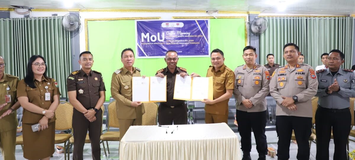 MITRA,SULAWESION.COM-Bupati Minahasa Tenggara (Mitra), Ronald Kandoli, menghadiri kegiatan Coffee Morning yang dirangkaikan dengan penandatanganan Nota Kesepahaman (MoU) bersama Kepala Kejaksaan Negeri Minahasa Selatan, La Ode M. Nusrim, SH, MH, Senin (25/8/2025).