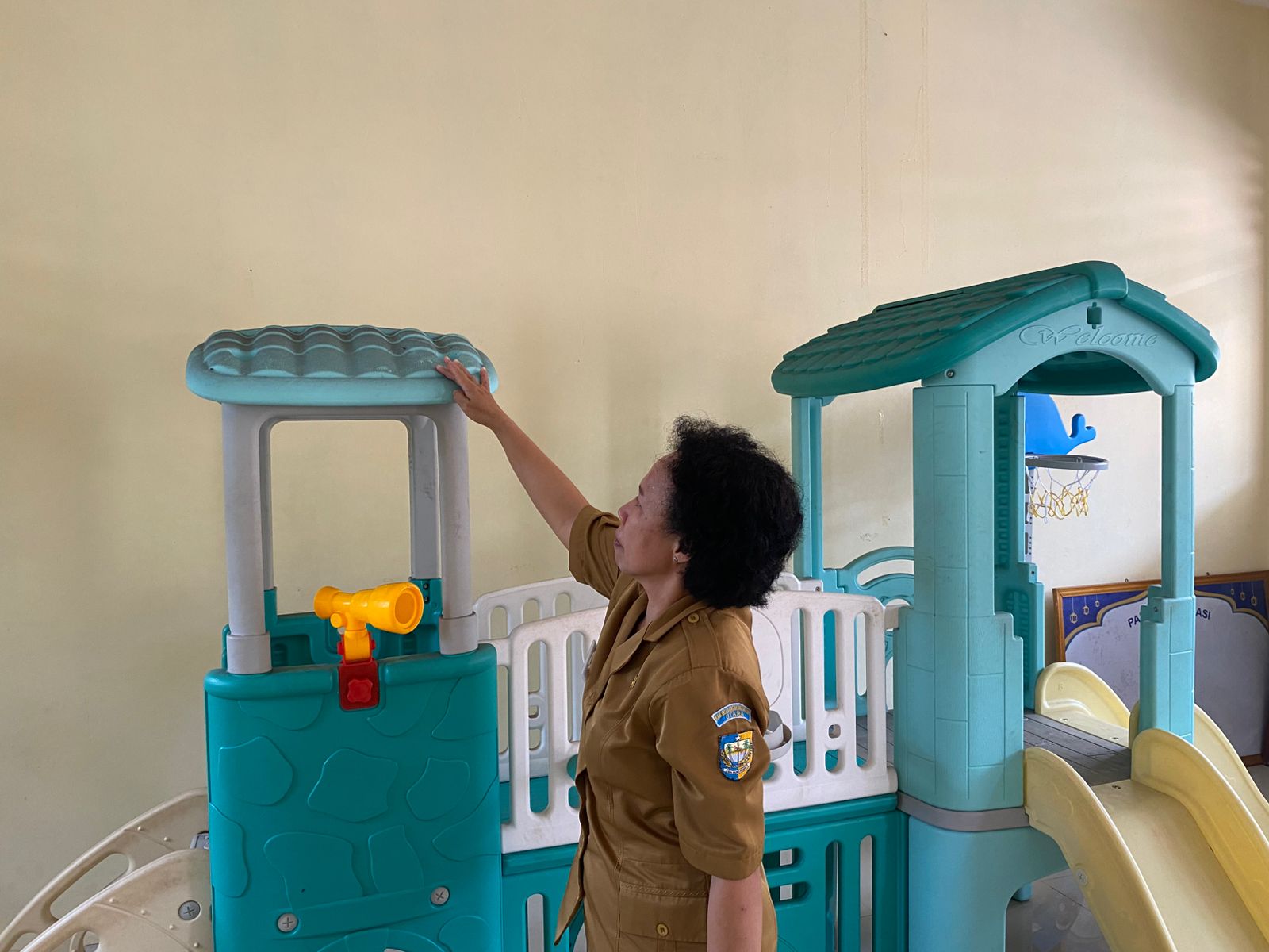 Disamping TK ada sekolah Pendidikan Usia Dini (Paud) KB Theodora. Tampak para guru sedang membersihkan lantai yang terlihat debu berwarna hitam.