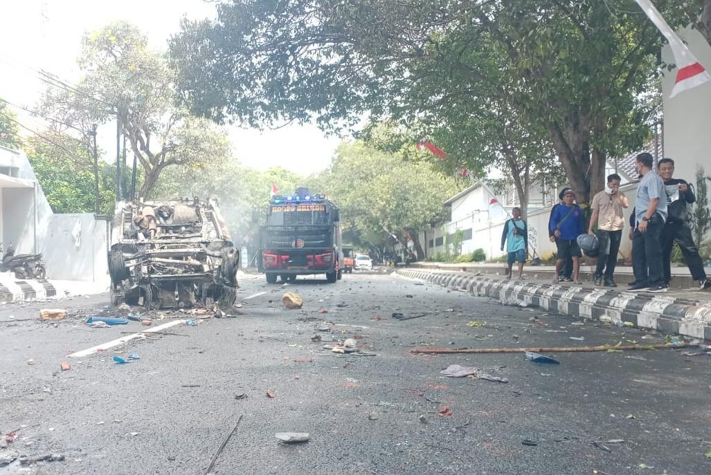 Dalam situasi yang semakin memanas, sekelompok orang terlihat menyiramkan bensin ke mobil patroli yang terparkir di pinggir jalan. Api cepat membakar seluruh bagian mobil, diikuti pembakaran lima unit sepeda motor yang terparkir di lokasi berbeda. Kobaran api dan asap hitam membumbung tinggi, memaksa sebagian massa dan pedagang di sekitar alun-alun berlarian menjauh.