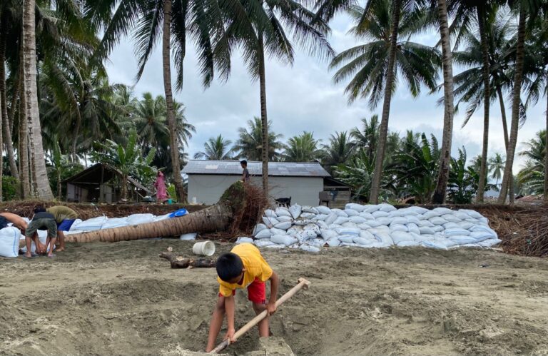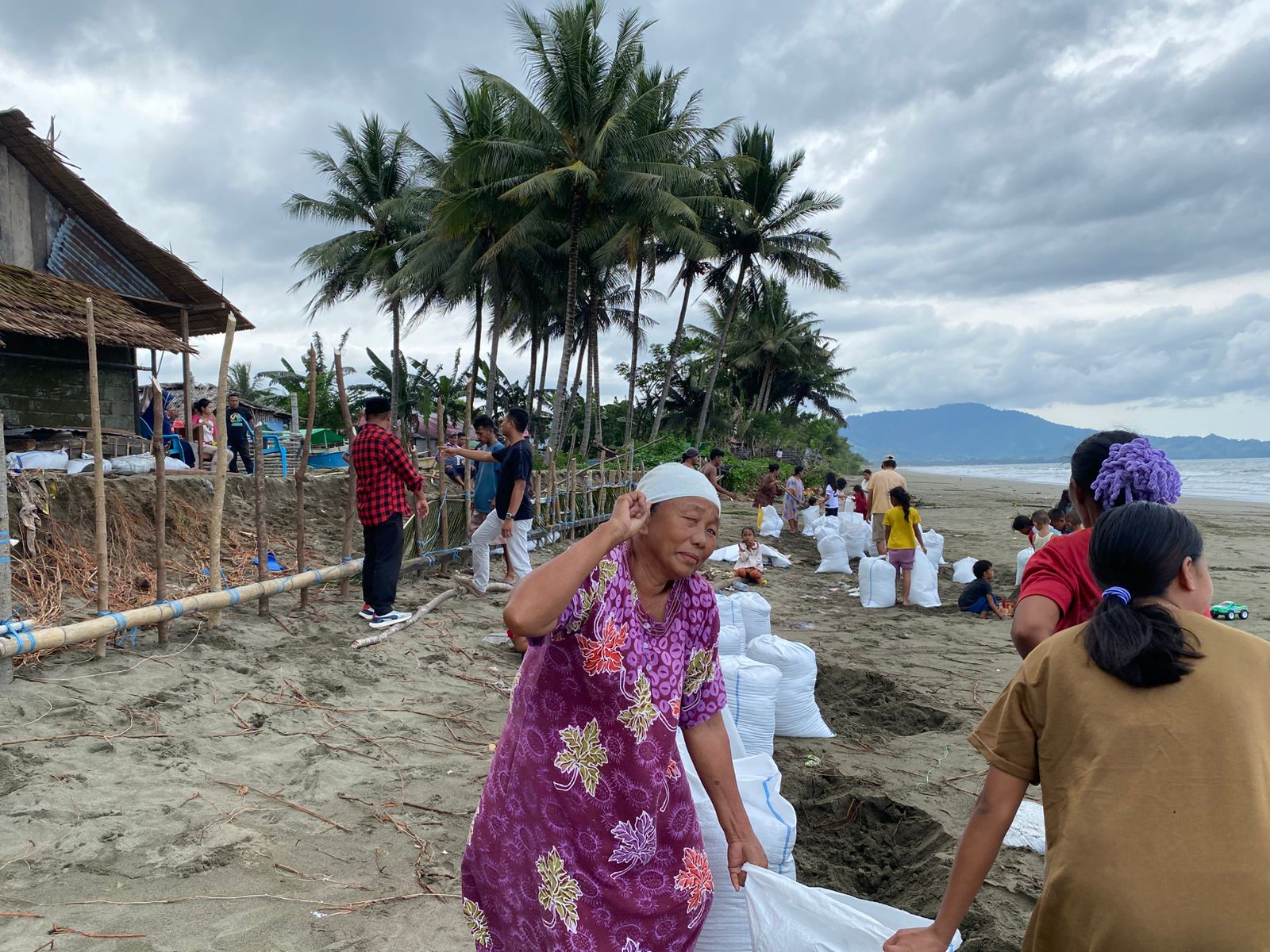 “Jadi hari ini kami kembali bekerja membuat tanggul dari karung yang berisi pasir,”ujar warga Bolangitang II ini.