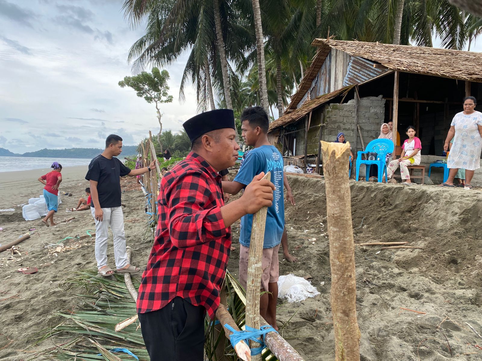 Dibawah terik matahari yang dihalangi pohon kelapa yang masih tersisa namun tinggal menunggu waktu akan roboh. Saya melihat dari kejauhan ada empat orang yang sedang mengisi karung dengan pasir.