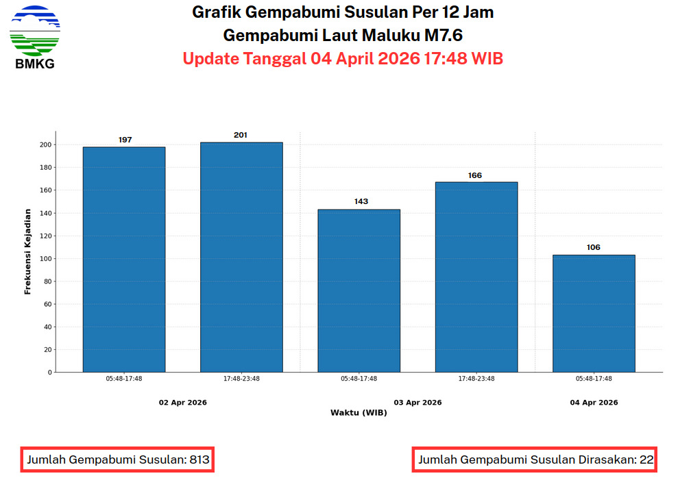 SULUT,SULAWESION.COM– Badan Meteorologi, Klimatologi, dan Geofisika (BMKG) mencatat hingga Sabtu 4 April 2026 pukul 17.48 WIB telah terjadi 813 gempa bumi susulan usai gempa bumi yang terjadi di Bitung, Sulawesi Utara (Sulut).