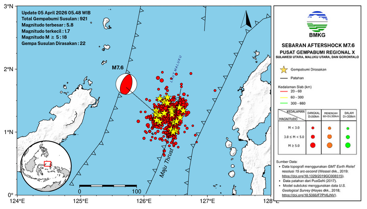 SULUT,SULAWESION.COM- Badan Meteorologi, Klimatologi, dan Geofisika (BMKG) mencatat hingga Minggu 5 April 2026 pukul 05.48 WIB telah terjadi 921 gempa bumi susulan usai gempa bumi yang terjadi di Bitung, Sulawesi Utara (Sulut).