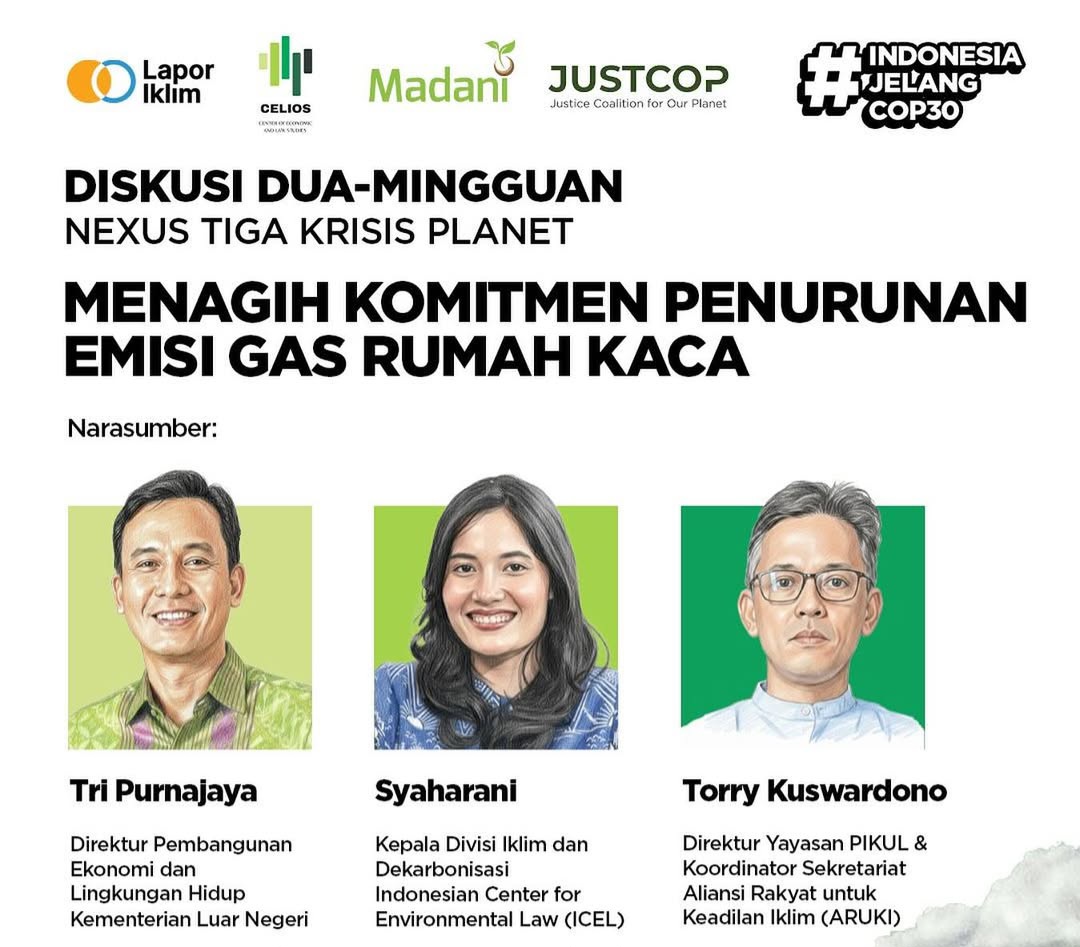 Turut hadir dalam diskusi tersebut Tri Purnajaya, Direktur Pembangunan Ekonomi dan Lingkungan Hidup Kementerian Luar Negeri dan Torry Kuswardono, Koordinator Sekretariat Aliansi Rakyat untuk Keadilan Iklim.
