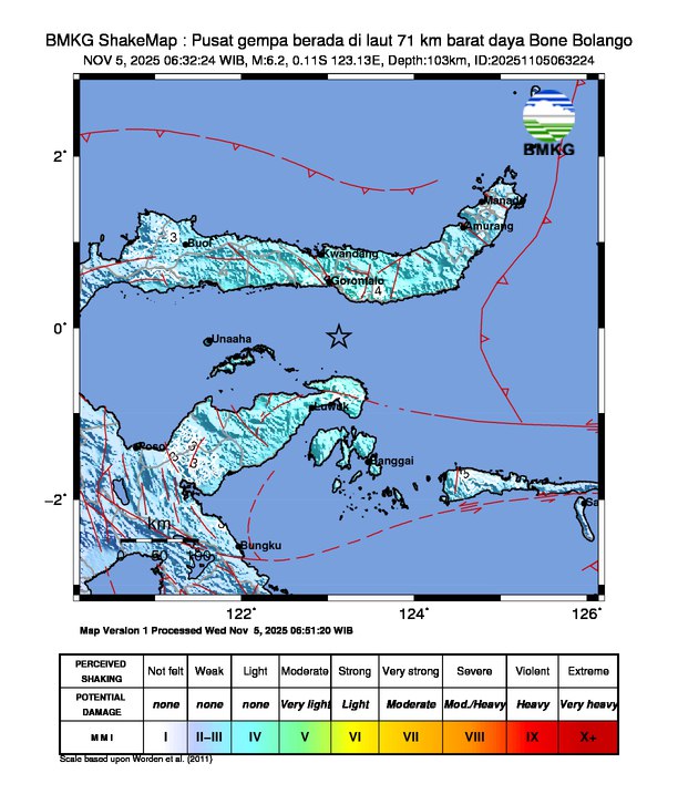 BOLMUT,SULAWESION.COM– Wilayah Teluk Tomini Kabupaten Bone Bolango, Provinsi Gorontalo diguncang gempa tektonik, Rabu 5 November 2025.