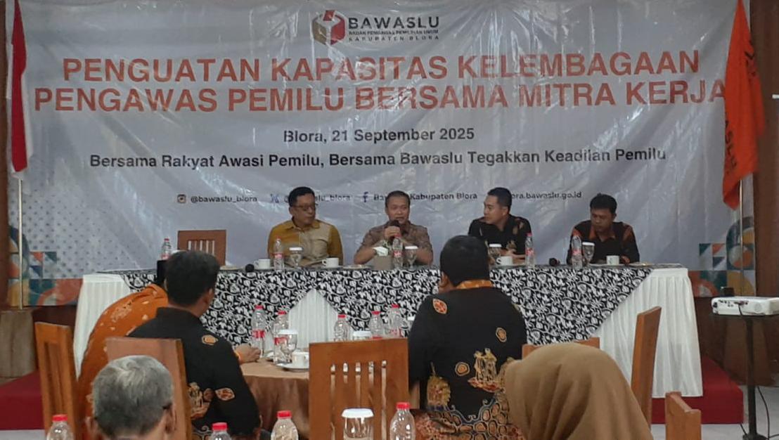 BLORA,SULAWESION.COM — Badan Pengawas Pemilihan Umum (Bawaslu) Kabupaten Blora menegaskan pentingnya peran mitra kerja dalam menjaga kualitas demokrasi. Hal itu disampaikan dalam kegiatan penguatan kapasitas kelembagaan pengawas pemilu bersama mitra strategis yang digelar di De Garden Tunjungan, Blora, Minggu (21/9/2025).