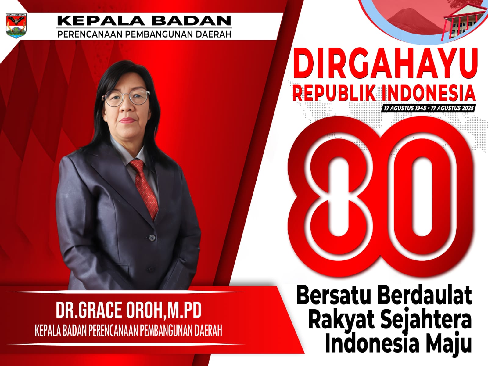 MITRA,SULAWESION.COM-Kepala Badan Perencanaan Pembangunan Daerah (Bappeda) Kabupaten Minahasa Tenggara (Mitra), Dr. Grace Oroh, M.Pd, bersama seluruh jajaran pegawai menyampaikan ucapan Selamat Hari Ulang Tahun ke-80 Kemerdekaan Republik Indonesia, 17 Agustus 2025.