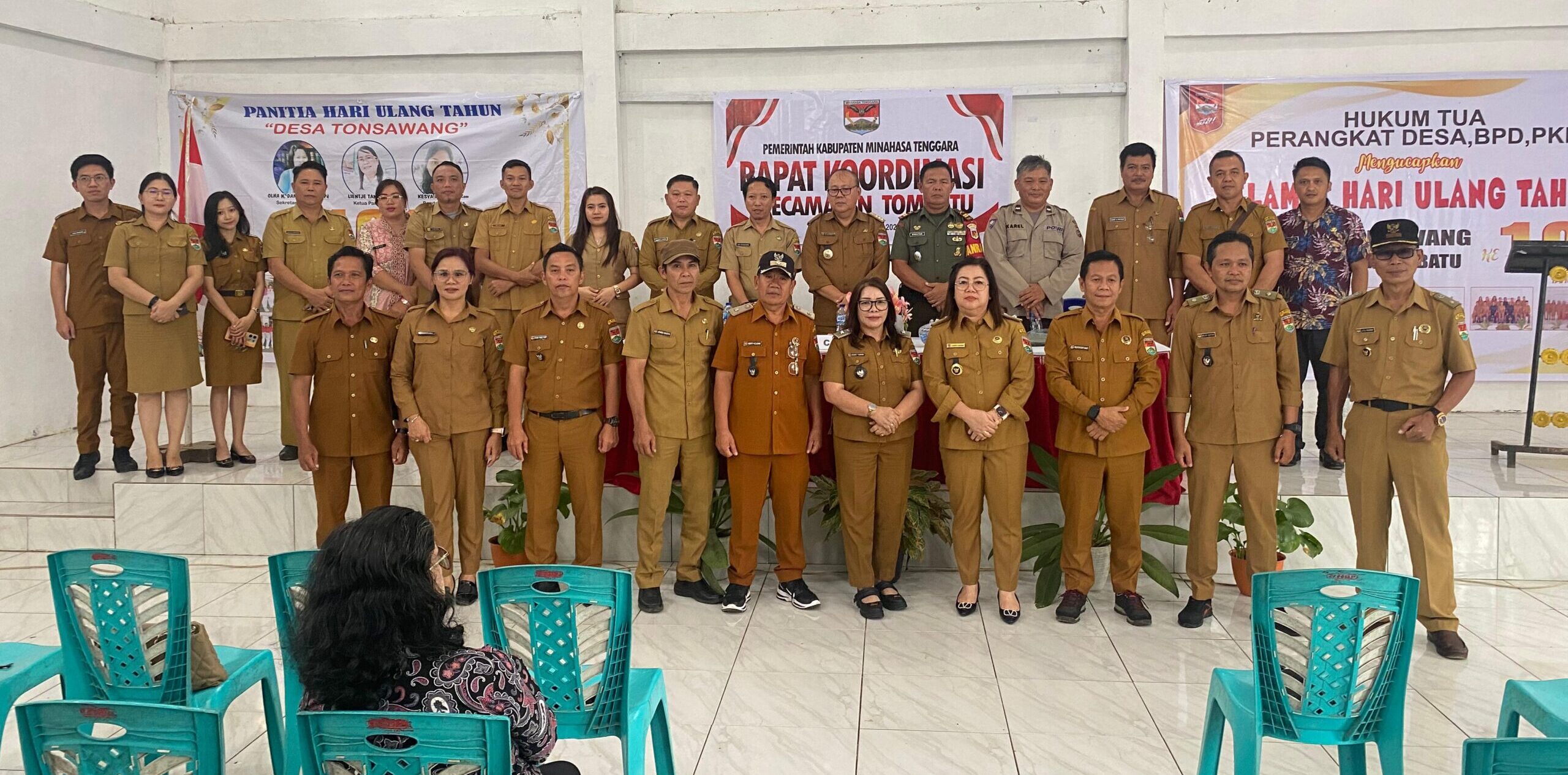 MITRA,SULAWESION.COM-Pemerintah Kecamatan Tombatu menggelar Rapat Koordinasi (Rakor) bersama pemerintah desa, unsur Forum Komunikasi Kecamatan, dan instansi terkait di Balai Pertemuan Umum (BPU) Desa Tonsawang Kecamatan Tombatu Kabupaten Minahasa Tenggara, Selasa (7/10/2025).
