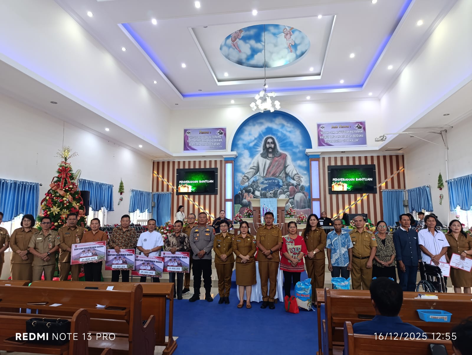 Pada kesempatan tersebut, Pemerintah Kabupaten Minahasa Tenggara juga berbagi kasih dengan masyarakat melalui penyerahan sejumlah bantuan. Bantuan yang disalurkan antara lain bantuan sosial berupa kursi roda bagi penyandang disabilitas, bantuan natura, bantuan benih jagung bagi kelompok tani, serta penyerahan secara simbolis bantuan hibah rumah ibadah tahun 2025.