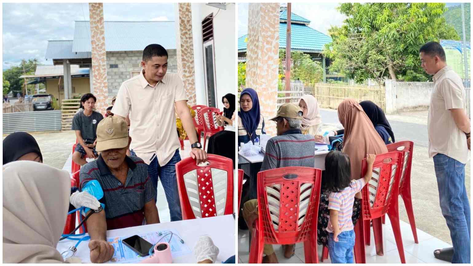Sangadi Buyat Satu Chandra Setiawan Modeong mendampingi para mahasiswa UM Manado dalam pelayanan pemeriksaan kesehatan gratis kepada warga setempat pada Jumat 6 Februari 2026. (Foto: PEMDES BUYAT SATU)