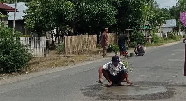 BOLMUT,SULAWESION.COM- Warga desa Sonuo, Kecamatan Bolangitang Barat, Kabupaten Bolaang Mongondow Utara (Bolmut) bergotong royong menutupi jalan berlubang, Senin 16 Februari 2026.